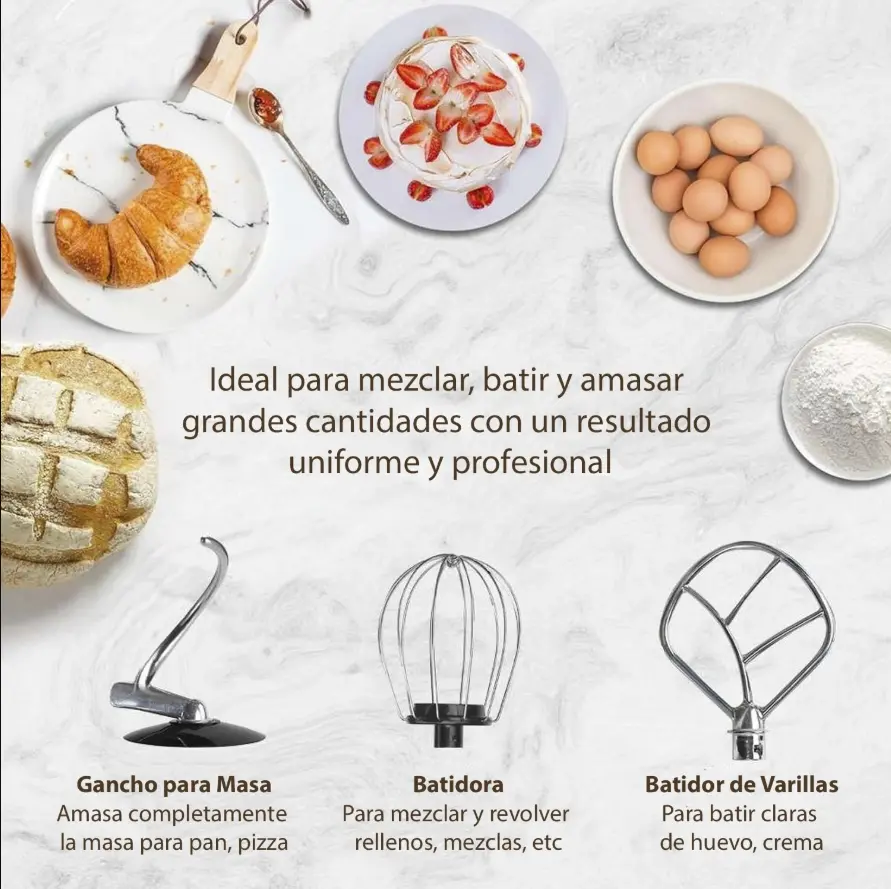 Diseñada para los amantes de la repostería y la cocina creativa, esta batidora planetaria combina potencia y capacidad en un solo equipo. Con 1200W y un bowl de 5 litros, garantiza mezclas homogéneas incluso en preparaciones exigentes. Su diseño moderno y robusto ofrece durabilidad, practicidad y un desempeño profesional en tu cocina.